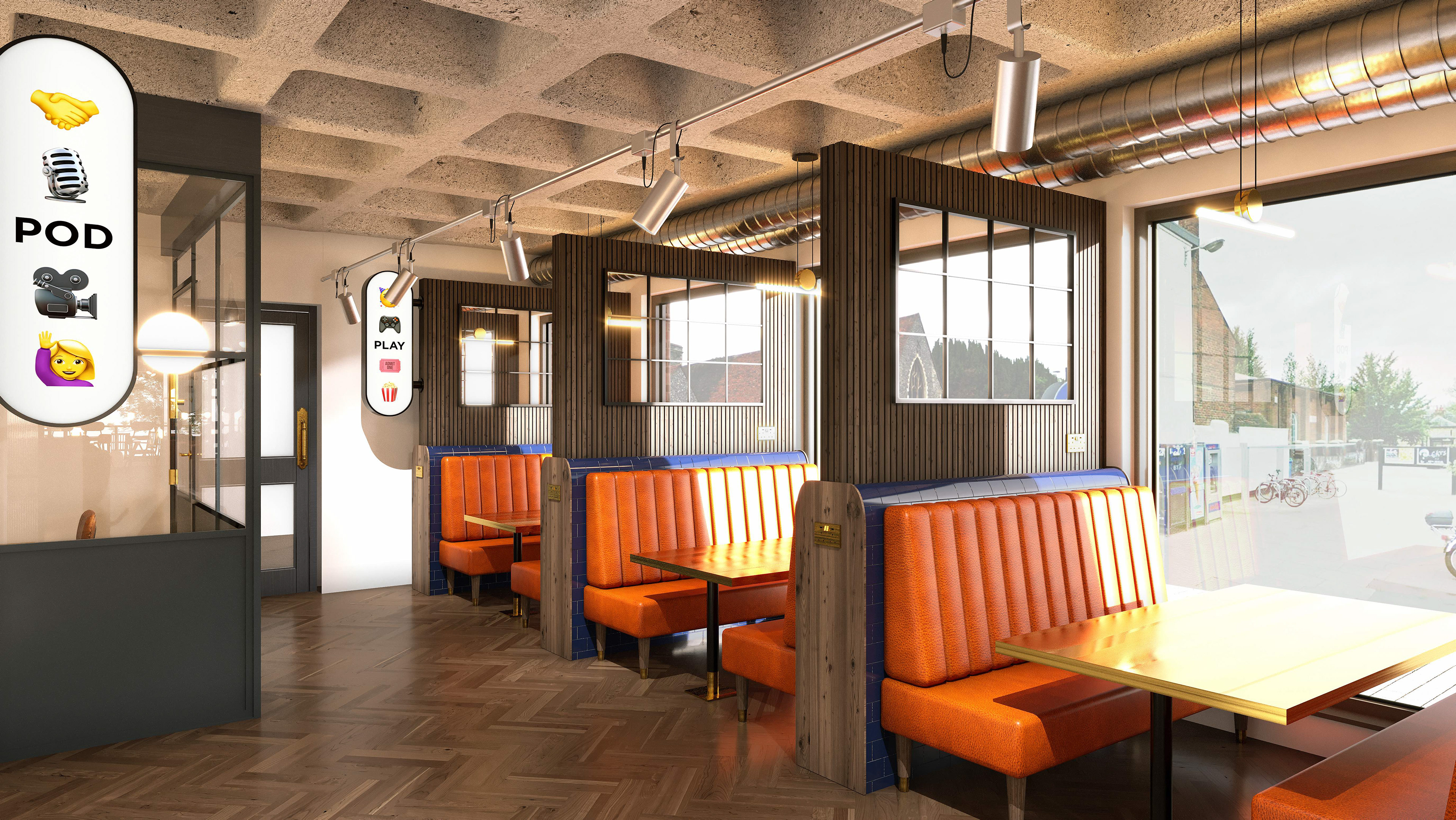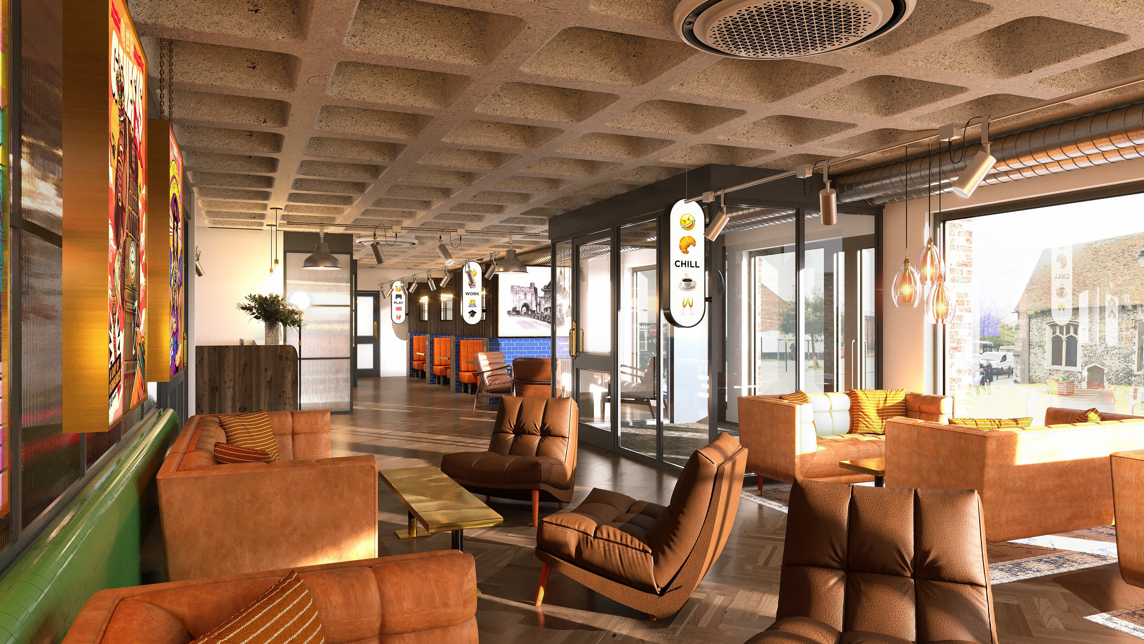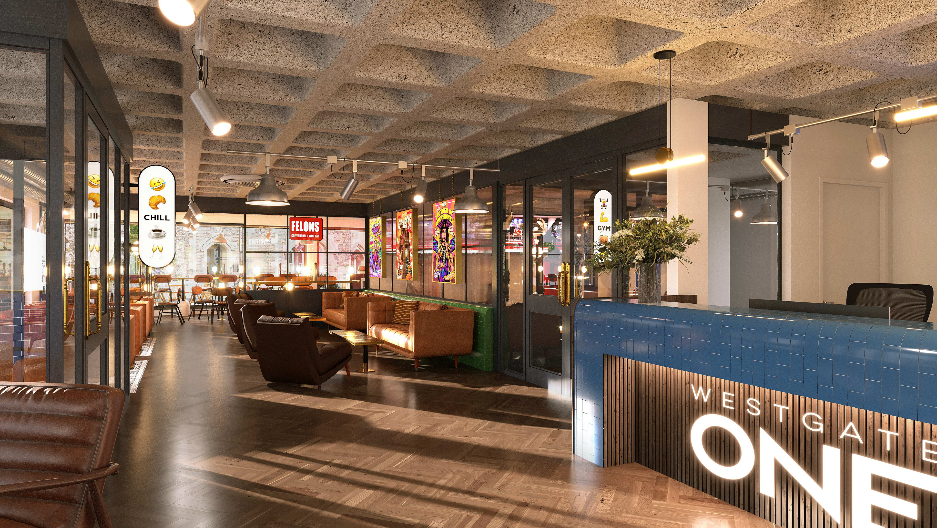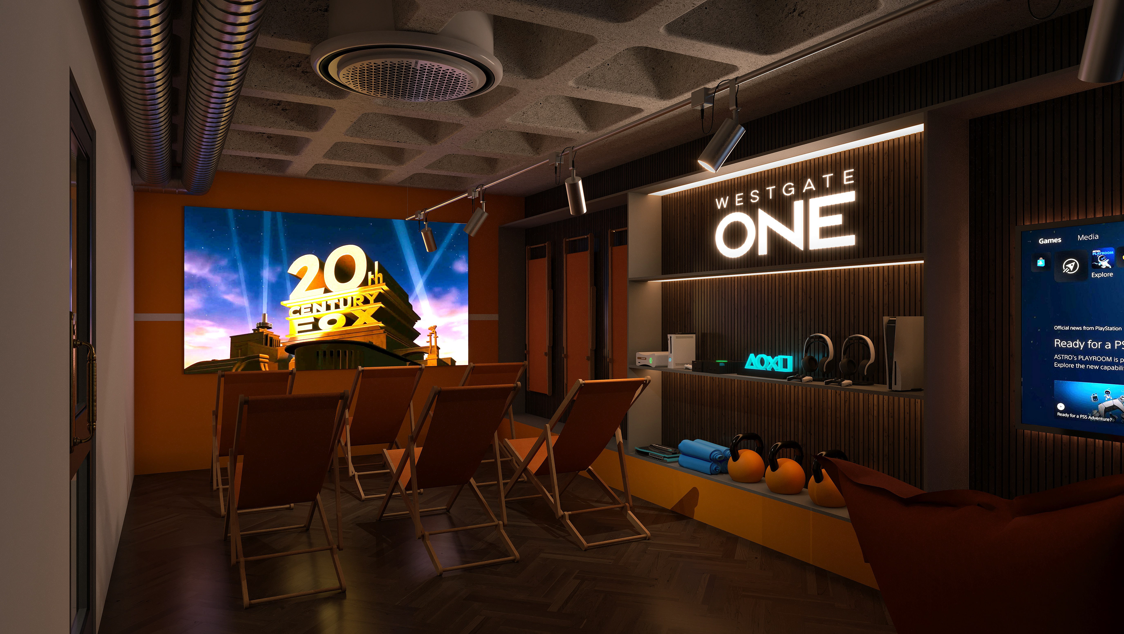 Interior design and fit out for the Westgate One student development by Paul Roberts Canterbury. Ground floor student reception, cinema, games room, study area, lounge area, gym and coffeehouse.